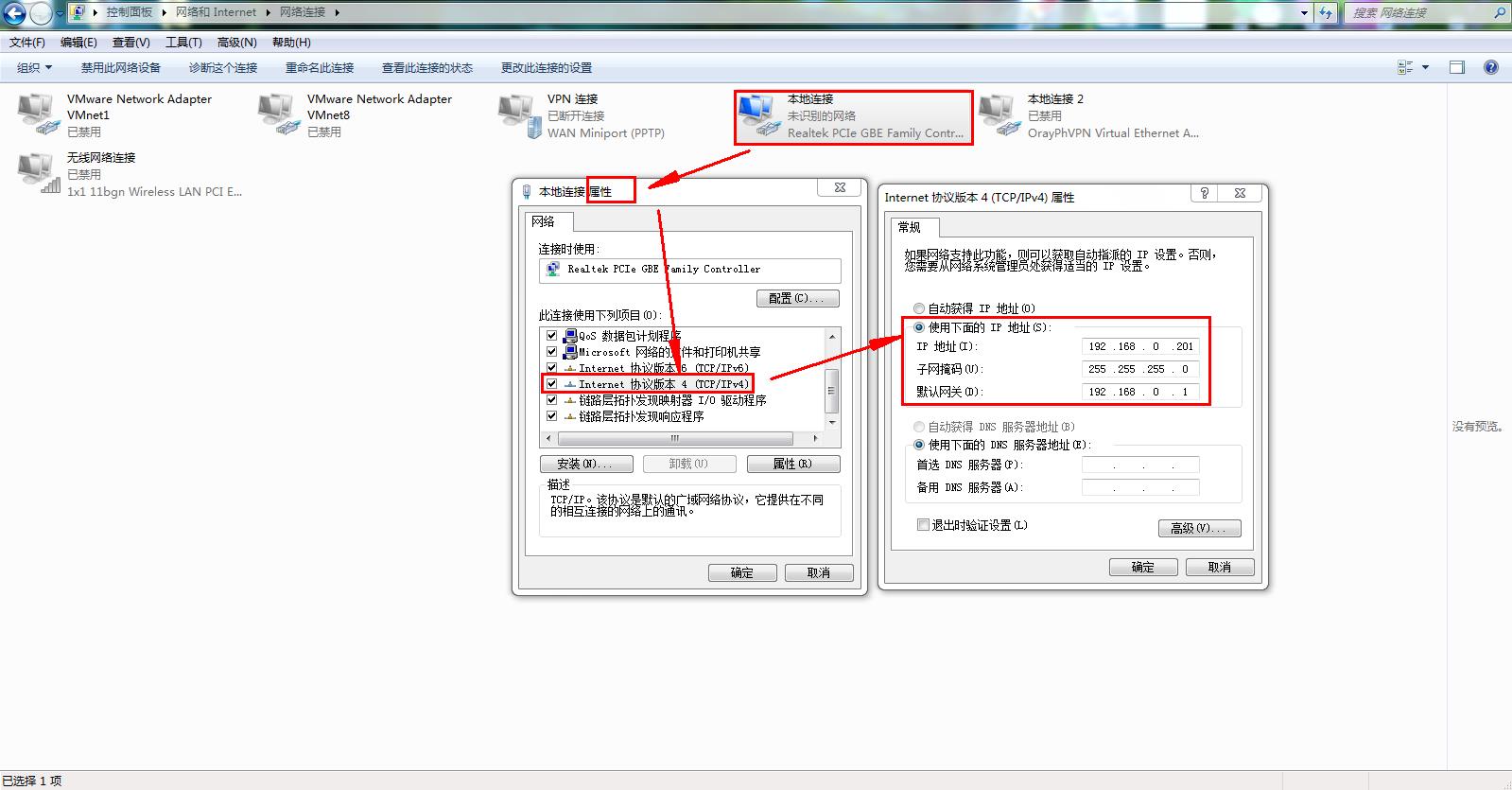 電腦打開控制面板,只保留本地連接網(wǎng)卡,禁用其他網(wǎng)卡。本地連接右擊屬性,找到IPv4,將IPv4的參數(shù)設(shè)置靜態(tài)IP,192.168.0.201,子網(wǎng)掩碼255.255.255.0,網(wǎng)關(guān)192.168.0.1