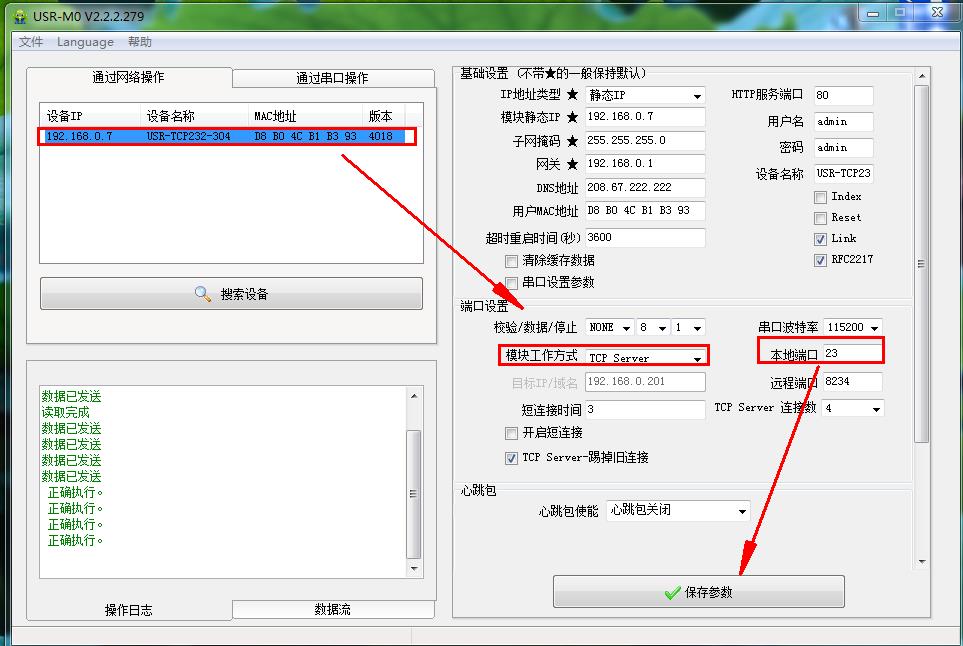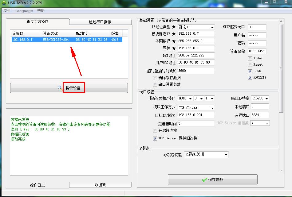 用M0設(shè)置軟件搜索設(shè)備,獲取304 的IP參數(shù)