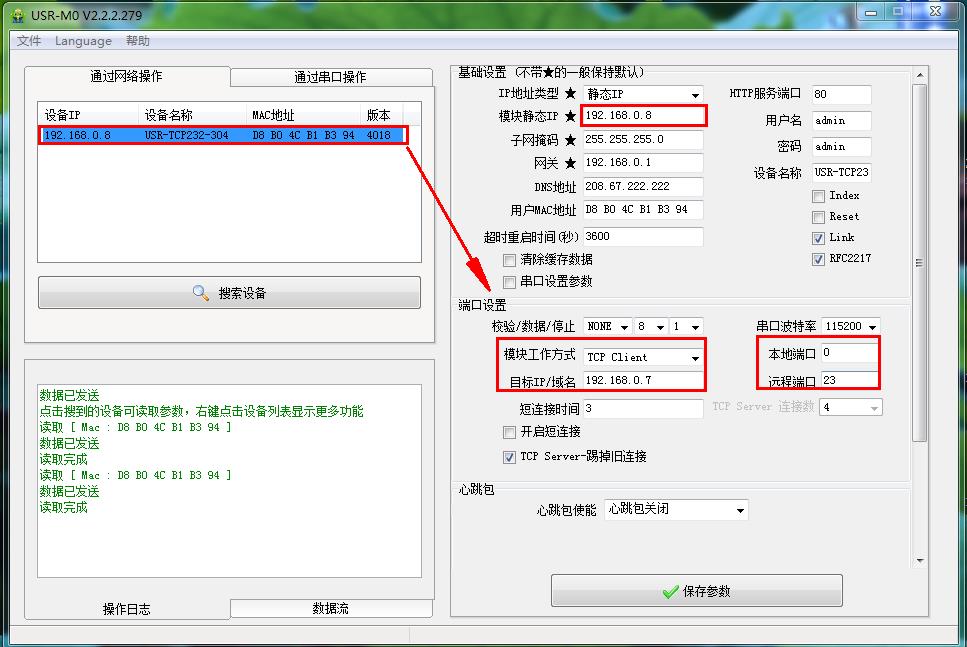 用M0配置軟件搜索設(shè)備,設(shè)置參數(shù)之后,2個(gè)USR-TCP232-304網(wǎng)線直連,或者都接同一個(gè)交換機(jī)。