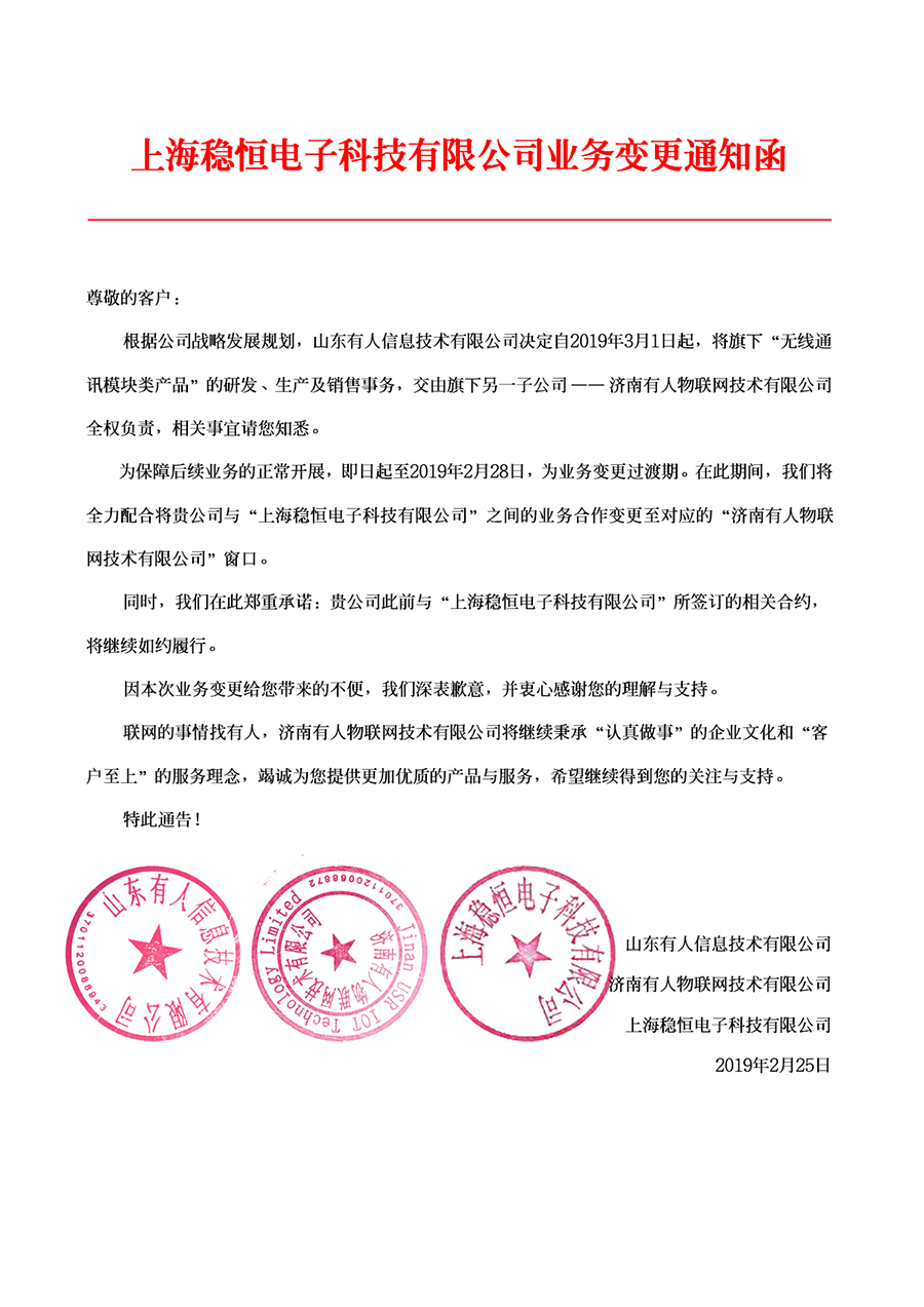 有人科技子公司上海穩恒電子科技業務變更通知函