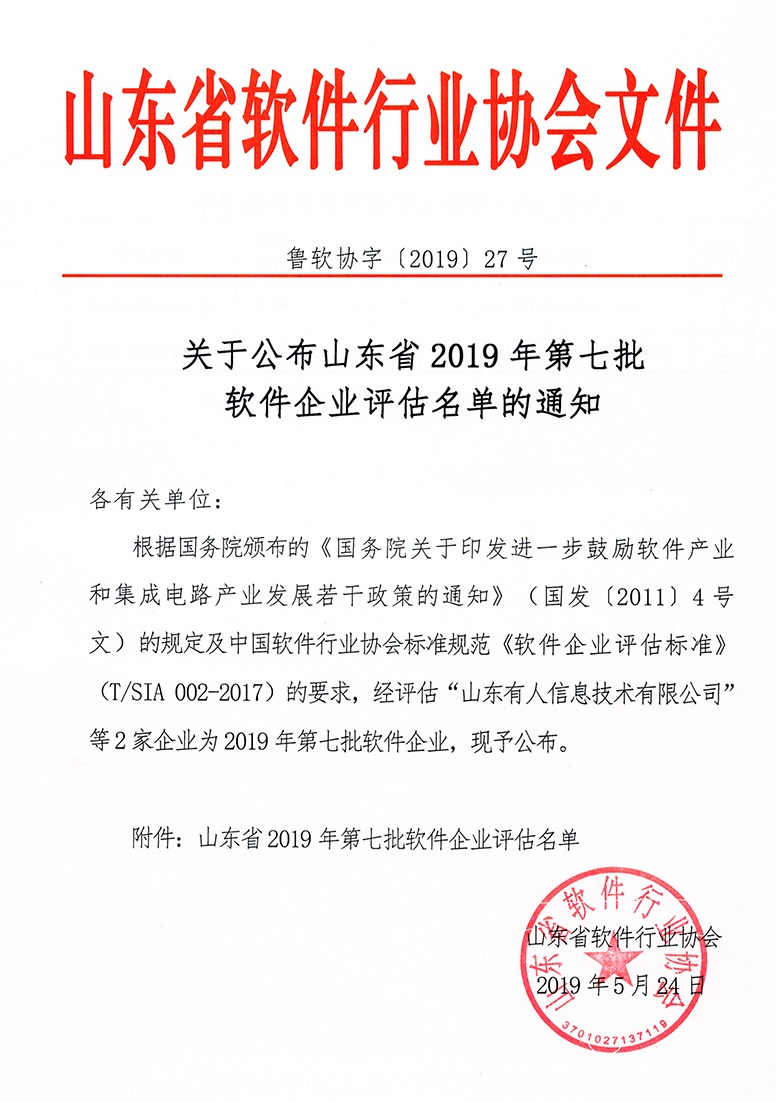 在“山東省2019年第七批軟件企業”評估中,有人物聯網被山東省軟件行業協會認證為軟件企業。聯想到之前已經獲得的軟件產品認證,這也意味著,有人正式成為“雙軟企業”。