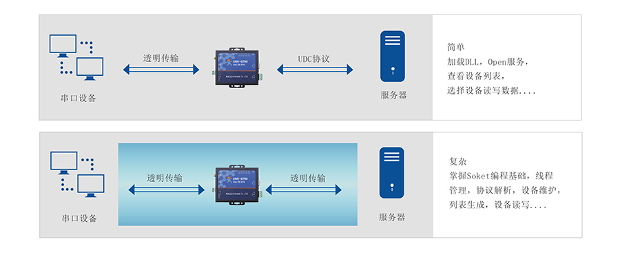 4G DTU在此工作模式下,網絡透傳模式上增加特定的注冊包和心跳包,并且對數據進行組包。這種模式更方便用戶使用和二次開發,用戶可以理解成加入 UDC 協議的網絡透傳模式。此模式下,我們提供了服務器端二次開發包,用戶在將鏈接庫加入到自己的工程后,就可以通過調用我們提供的接口,快速開發自己的服務端,好處在于設備的上線情況和數據傳輸既能被用戶所掌握,也可以由用戶來控制,既方便了用戶開發,也提高了服務器端的統一性,穩定性和可靠性。