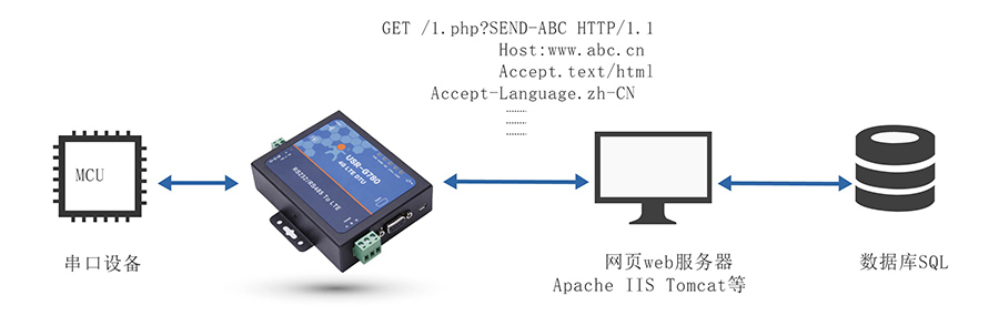 4G DTU在此工作模式下,用戶的終端設備,可以通過本設備發送請求數據到指定的 HTTP 服務器,然后設備接收來自 HTTP 服務器的數據,對數據進行解析并將結果發至串口設備。用戶不需要關注串口數據與網絡數據包之間的數據轉換過程,只需通過簡單的參數設置,即可實現串口設備向 HTTP 服務器的數據請求。設備默認會過濾接收到的數據,只將用戶數據部分輸出到串口,客戶可以使用 AT 指令選擇是否過濾 HTTPD 數據。