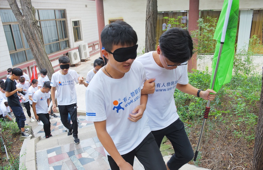 規則:一人戴上“眼罩”扮演“盲人”,一人扮演“聾啞人”,兩人為伴,相扶前行。