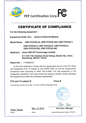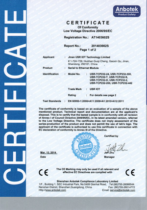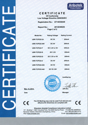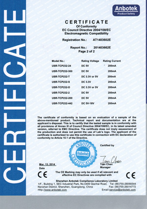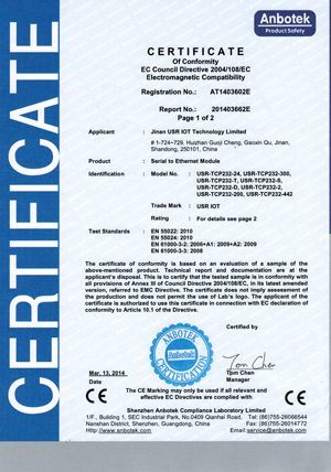 2014年3月28日,在公司全體員工共同努力下,在做了大量的技術和管理工作后,我公司USR-T24系列核心成功獲得CE認證證書, CE證書的獲得標志著有人科技取得了順利進入歐盟及歐盟自由貿易協會國家市場的通行證,為公司海外市場的開拓奠定了基礎;同時也標志我公司的產品又上了一個新臺階!
