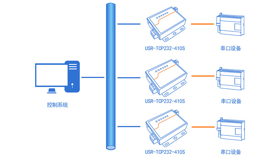 串口服務器的使用通常是串口端RS232/485連接串口設備,另一端與網口相連,RS232和RS485串口同時獨立工作,互不影響