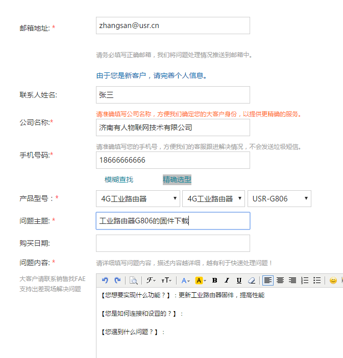 第二步:選擇您想下載固件的工業路由器型號,并填寫好相關問題描述