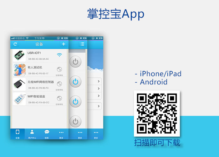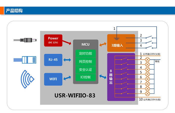 USR-WIFI-IO-83控制終端是有人物聯網研發的用于智能家居、物聯網等領域的終端設備,只要使用掌控寶的windows/IOS/Android等平臺的控制軟件,用戶便可輕松實現“局域網和遠程的監測控制”。 USR-WIFI-IO-83同時支持WIFI和網線連接,支持三路開關量監測(輸入),八路繼電器控制(輸出)。 |