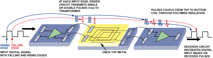 變壓器原邊的電路將輸入邏輯轉(zhuǎn)換編碼為1 ns的脈沖,然后通過變壓器耦合。如圖3所示,次級側(cè)的電路檢測到它們并重新創(chuàng)建輸入信號,即使沒有輸入跳變,輸入側(cè)的刷新電路也可確保輸出狀態(tài)與輸入狀態(tài)匹配。這對于上電情況以及低數(shù)據(jù)速率或恒定直流輸入的輸入波形很重要。