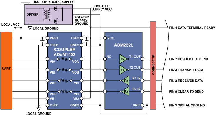 RS-232通常用于連接多個系統(tǒng),因此每個系統(tǒng)與總線之間的隔離至關(guān)重要。數(shù)字隔離器不支持RS232標(biāo)準(zhǔn),因此不能在收發(fā)器和電纜之間使用;而是在收發(fā)器和本地系統(tǒng)之間使用它們。收發(fā)器的系統(tǒng)端通常使用0 V至3 V或0 V至5 V邏輯電平連接到通用異步接收器/發(fā)送器(UART)或處理器。因為i的輸入和輸出電路耦合器隔離器彼此電氣隔離,可以將其放置在UART和收發(fā)器之間,這是將系統(tǒng)與電纜隔離的一種簡單方法。為了完成隔離,使用隔離的DC-DC轉(zhuǎn)換器為隔離器和收發(fā)器供電。所述的組合ADuM1402 我耦合器數(shù)字隔離器,ADM232L RS-232收發(fā)器,和隔離電源,如圖6所示,避免了接地環(huán)路,并提供防止浪涌破壞的有效保護。