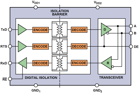 由于RS-485通常用于連接多個系統(tǒng),因此每個系統(tǒng)與總線之間的隔離至關(guān)重要。與RS-232一樣,數(shù)字隔離器也不支持RS-485標(biāo)準(zhǔn),因此不能在收發(fā)器和電纜之間使用。而是在收發(fā)器和本地系統(tǒng)之間使用它們。收發(fā)器的系統(tǒng)端通常連接到本地總線或處理器。由于i耦合器隔離器的輸入和輸出電路彼此電氣隔離,因此在處理器和收發(fā)器之間插入一個是將系統(tǒng)與電纜隔離的簡單方法。為了完成隔離,使用隔離的DC-DC轉(zhuǎn)換器為隔離器和收發(fā)器供電。ADuM1301 i的組合圖8所示的耦合器數(shù)字隔離器和隔離式電源消除了接地環(huán)路,并提供了有效的保護,以防電涌損壞。