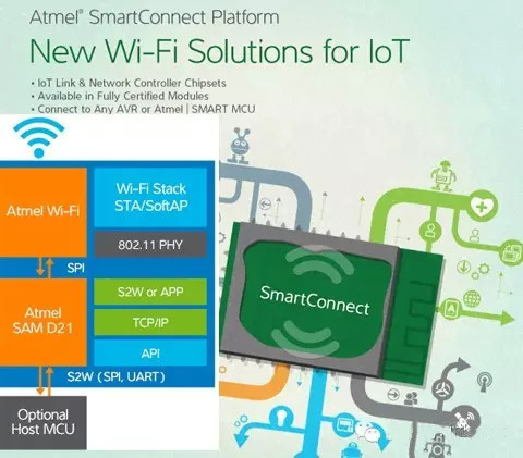 鑒于物聯網市場的強大攻勢,Atmel在融合其在無線與控制兩方面的強大優勢,2014年6月份,Atmel推出了全新的MCU品牌--Atmel SMART以及SmartConnect SAM W23模塊,該模塊基于 Atmel超低功率WiFi系統芯片,實現了低功率MCU與Wi-Fi解決方案的結合。SAM W23模塊整合了WiFi功能,設計人員無需再學習WiFi堆棧,從而能夠專注于提升產品功能。