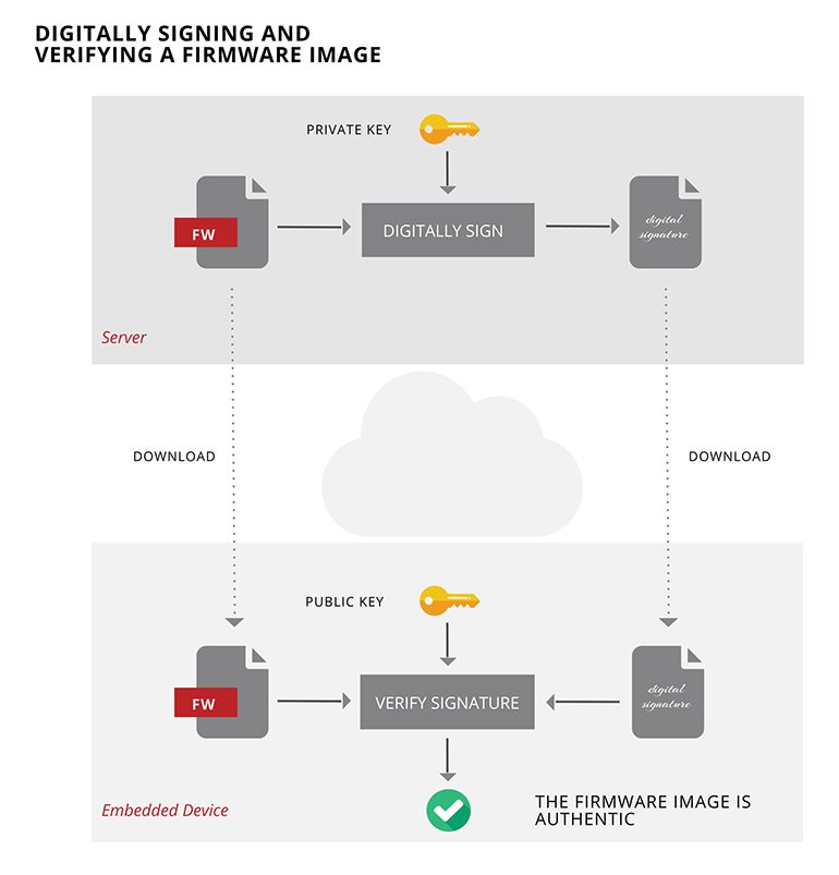 很明顯,因為使用私鑰進行數字簽名的任何文件都會被認證為合法文件,所以私鑰必須安全地保存在安全的地方,以免被別人濫用。所以,我們提供了一種方法來證明其下載的固件映像和來源可靠的固件映像一樣,所以安裝是安全的,還是偽造的而且肯定無法安裝。
