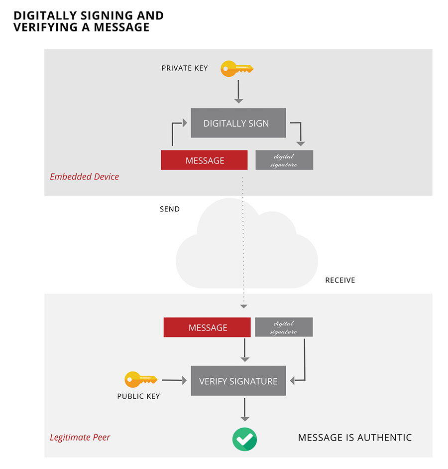 當設備在密鑰協商過程中將其消息發送給對等方時,它將使用其私鑰對這些消息進行簽名。當對等方收到消息時,它將使用設備的公鑰驗證隨附的簽名,從而驗證消息實際上是由設備發送的。類似地,對等方使用其私鑰簽署其密鑰協議消息,并且設備使用對等方的公鑰對對等方進行身份驗證。更具體地,數字簽名采用陷門單向功能,類似于先前提到的RSA加密功能。