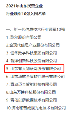 憑借在物聯網領域的持續貢獻與影響力,山東有人物聯網股份有限公司成功入圍2021年山東民營企業新一代信息技術行業領軍10強。