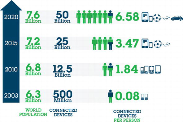 使用物聯網的主要思想是擁有一個智能系統并連接全球數十億臺設備。預計到 2020 年,通過物聯網設備連接在一起的設備預計將達到 500 億。下圖顯示了到 2020 年世界人口和連接設備的增長情況。連接如此龐大數量的設備需要高安全級別以防止詐騙并允許高水平的數據保護。因此,要獲得行業和個人所需的信任以利用物聯網共享他們的數據,實現高水平的安全性是一項巨大的挑戰。