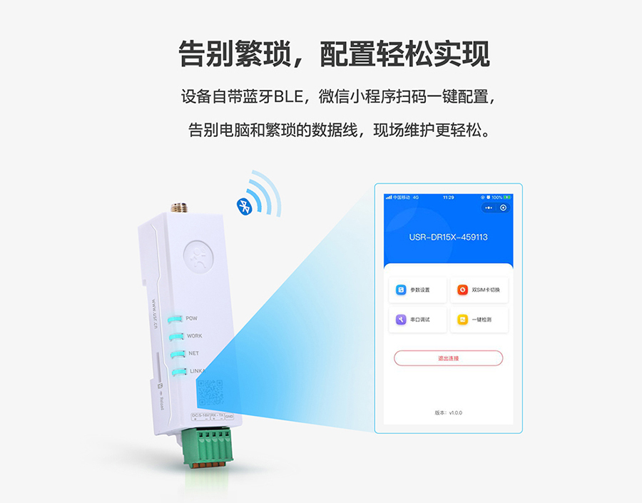 首先,DR154采用人性化設計,設備自帶藍牙BLE,用戶無需了解復雜的數據傳輸過程,也無需攜帶笨重的電腦,只需拿出手機,掃描DR154外殼上的二維碼,自動開啟藍牙建立連接,通過簡單配置,即可進行無線數據收發,完美解決小數據量在復雜環境中的超遠距通信問題。