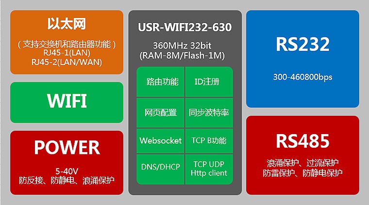 630網絡功能接口支持“WIFI”和“雙以太網口”,雙網口支持路由功能,串口功能接口支持“RS232”和“RS485”任意選擇一種(但不支持同時使用)。630不僅可以實現232/485轉WIFI、232/485轉以太網,甚至可以實現以太網與WIFI的雙向數據透傳。