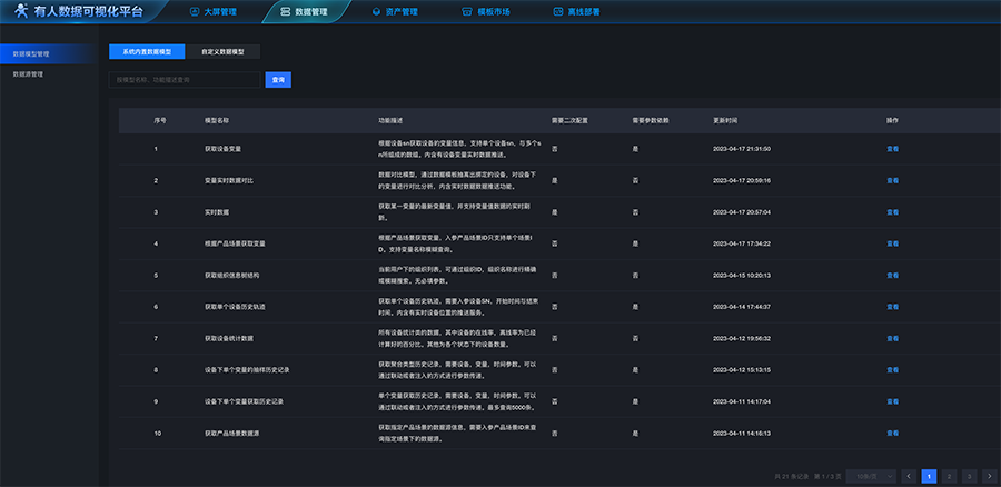 平臺提供豐富的數據模型,幫助用戶無需動用開發團隊即可輕松打造動態可視化大屏。