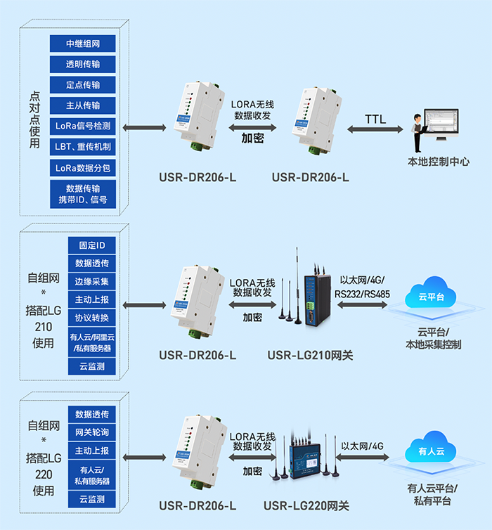 有人物聯(lián)密切關(guān)注LoRa應(yīng)用市場動態(tài),為滿足更廣泛的市場應(yīng)用及解決現(xiàn)場使用常見痛點,有人LoRa設(shè)備進行了全新升級,推出基于Sx1268芯片方案的LORA設(shè)備——WH-L101-L協(xié)議模組、USR-DR206-L直流導(dǎo)軌式DTU,無線數(shù)據(jù)傳輸最遠大于6公里!