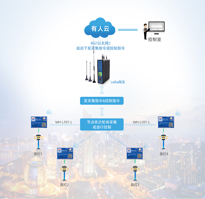 LoRa網(wǎng)關(guān)與節(jié)點配合使用,LoRa節(jié)點與路燈設(shè)備通過串口連接,與網(wǎng)關(guān)組成LoRa局域網(wǎng)絡(luò)并分區(qū)管理,網(wǎng)關(guān)把采集到的數(shù)據(jù)上傳到云服務(wù)器,并借助4G或以太網(wǎng)等技術(shù),遠程監(jiān)控太陽能路燈的實時狀態(tài)、遠程控制開關(guān)燈、調(diào)光、查詢歷史數(shù)據(jù)及統(tǒng)計分析等。
