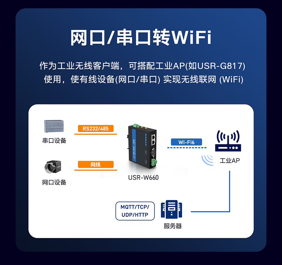 有人物聯“WiFi6家族”又添強力干將——WiFi6工業無線客戶端產品W660,它支持WiFi多模式、雙頻WiFi6、串口數據采集、千兆網口......功能亮點頗多,能為AGV小車、搬運機器人、巡檢機器人等移動場景帶來快速、穩定的無線體驗,一起解鎖更多亮點吧!