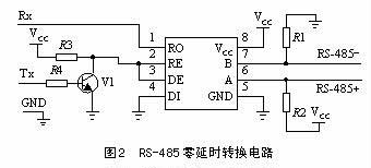 鑒于以上情況,筆者經(jīng)過(guò)探索和參照其它相關(guān)電路,設(shè)計(jì)了一種可以實(shí)現(xiàn)RS-485接收和發(fā)送零延時(shí)轉(zhuǎn)換的電路,如圖2所示。