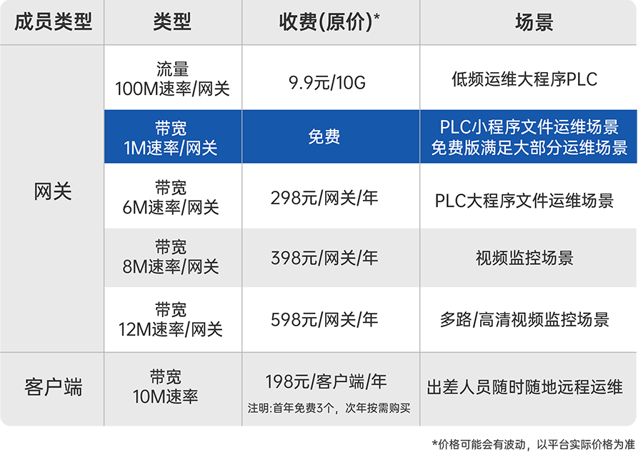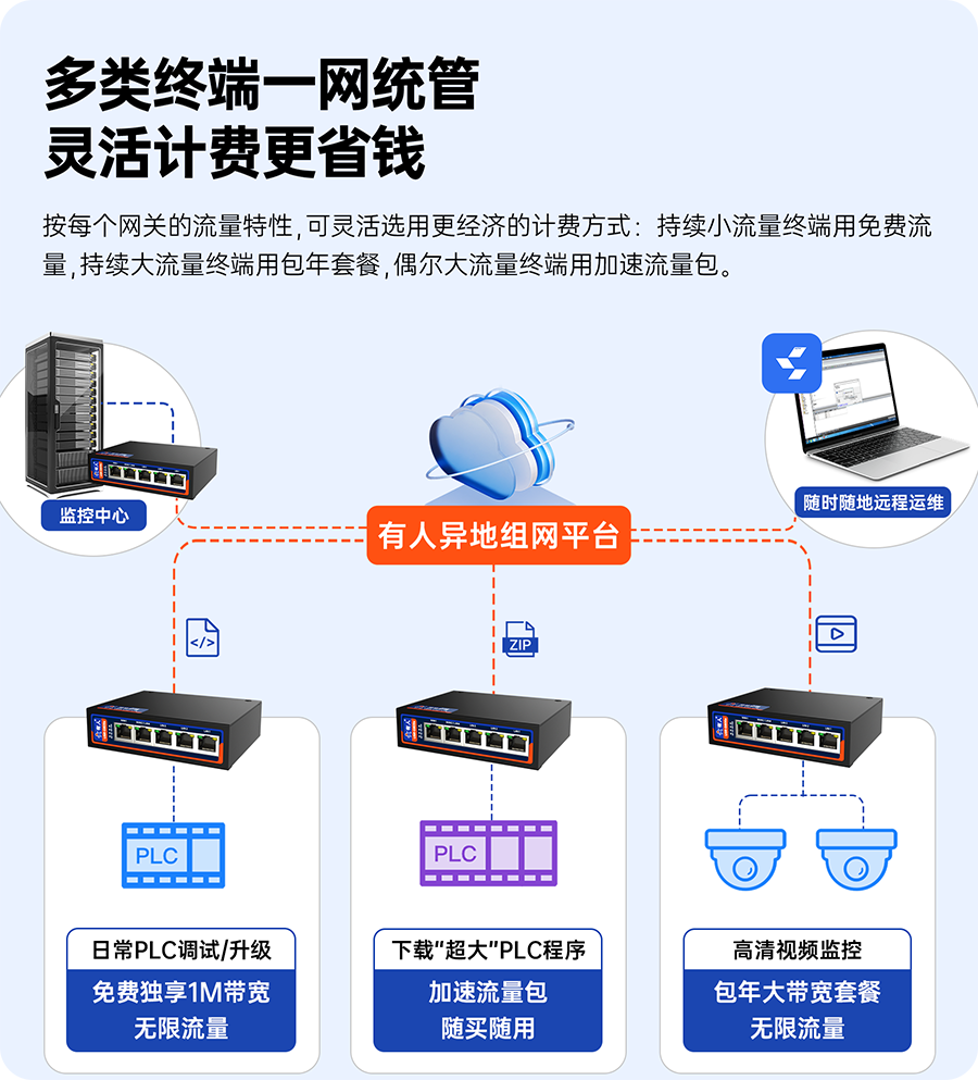 同一組網內根據每個網關下接終端的特性,可靈活選用更經濟的計費方式:持續小流量終端用免費1M帶寬,持續大流量終端推薦包年大帶寬,低頻大流量終端則適用組網流量包。