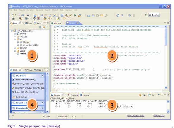 在LPCXpresso開(kāi)發(fā)界面里,快速啟動(dòng)面板里包含了使用最頻繁的各種操作選項(xiàng)。它位于窗口的左下角。