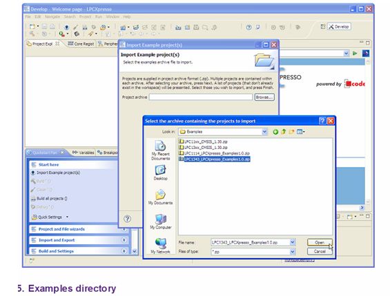 l 在快速啟動(dòng)面板中,單擊“Start Here”,然后選擇”Import Example project(s)“。如下圖所示。l 在彈出的頁(yè)面中,從“Browse”中選擇例程所在的目錄。根據(jù)提示打開(kāi)例程即可。如下圖。