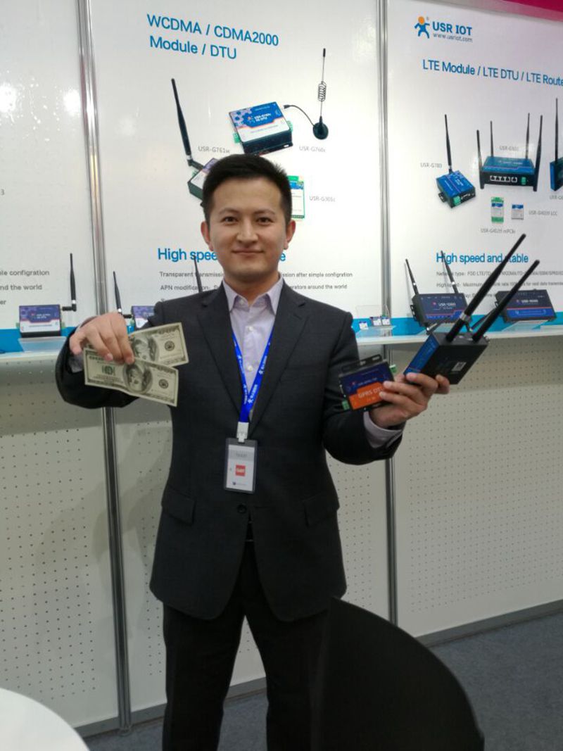 我們的銷售副總手持顧客已購買的GPRS DTU和4G工業路由器