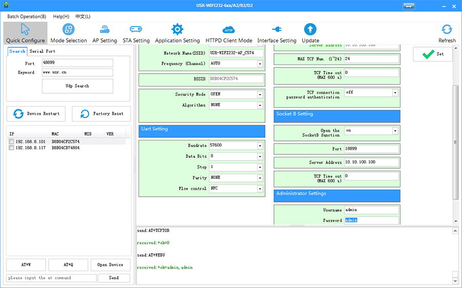 串口連接(或同一局域網(wǎng)內(nèi))可直接查詢及設(shè)置串口服務(wù)器及高性能系列模塊參數(shù)。無需登錄網(wǎng)頁及重復(fù)發(fā)送AT指令。支持一鍵固件升級,批量設(shè)置等功能。