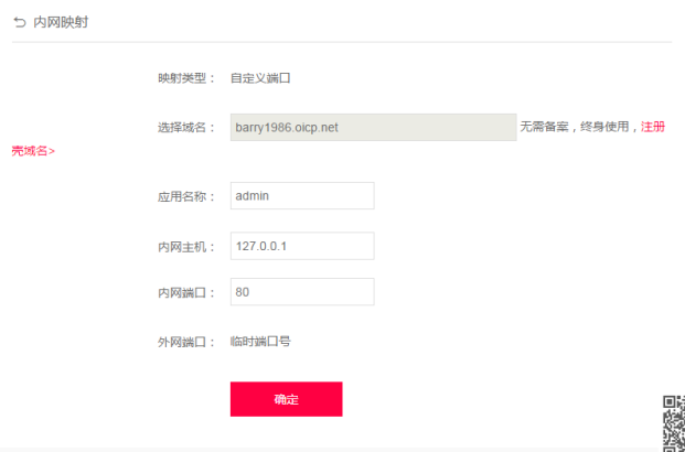 第七,添加、設置映射。網絡類型選擇自定義端口,域名選擇選項選擇要映射的域名。內網主機項填寫需要映射的設備的IP地址,內網端口填寫內網設備中的網絡端口。