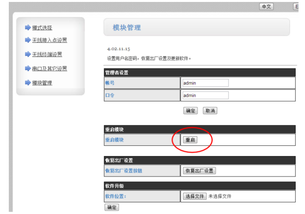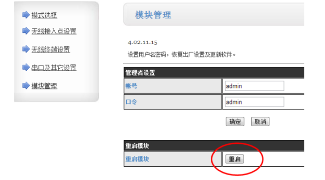 3.在“模塊管理”界面點擊“重啟”,模塊設置生效。對AP模塊的設置完成,將AP模塊斷電。