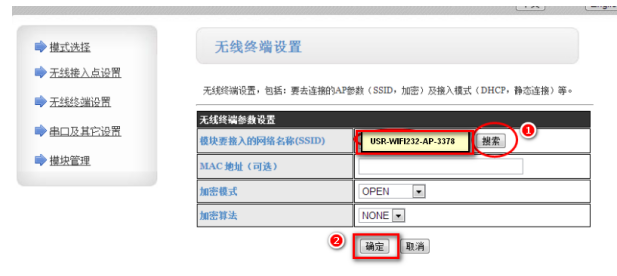 3.進入無線終端設置界面,點擊搜索,選擇搜索到的AP模塊的SSID,選擇完成后,點擊“確定”保存。