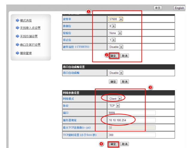 4.進入“串口及其它設置”頁面后,修改波特率數據位檢驗為停止位和設備、AP模塊一致,修改完后點擊”確定“保存,然后將網絡參數設置中的網絡模式改為Client,服務器地址改為10.10.100.254,點擊”確定“保存。