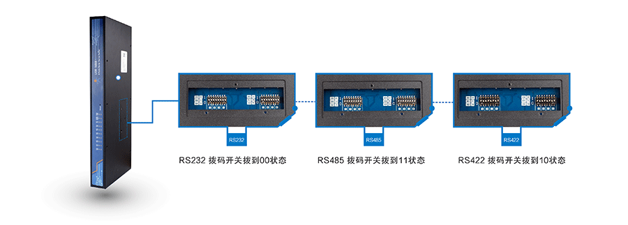 默認工作在RS485模式下,RS485/422串口要調節(jié)相應的撥碼位置。