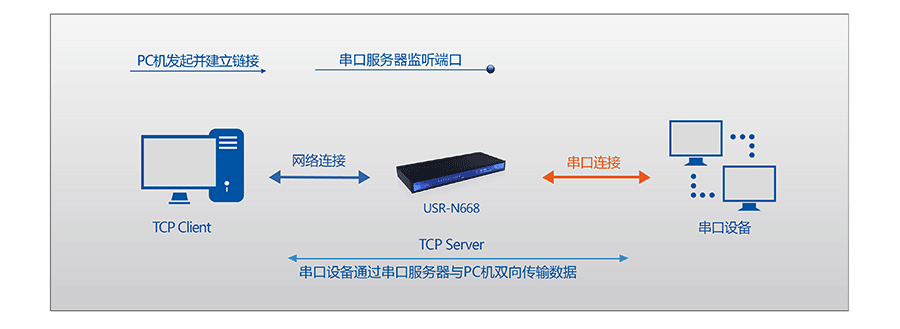 串口服務器監(jiān)聽設定的端口庫并等待TCP客戶端連接。