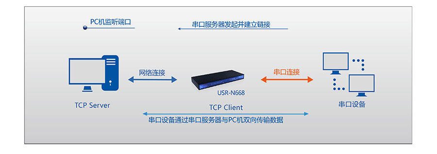 串口服務器向設定的IP地址發(fā)起TCP鏈接,若鏈接失敗,串口服務器將不斷嘗試重連直到成功。