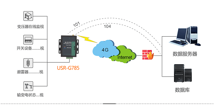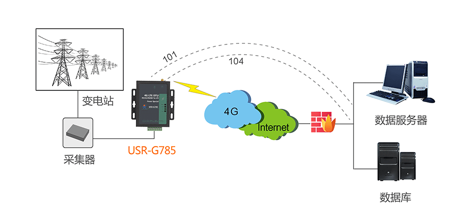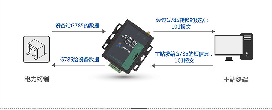 按照電力101協(xié)議傳輸數(shù)據(jù),DTU作為子站端的一部分,只需將數(shù)據(jù)通過(guò)串口發(fā)給DTU,USR-G785就會(huì)將101報(bào)文發(fā)送給服務(wù)器。