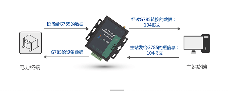 按照電力104協(xié)議傳輸數(shù)據(jù),DTU作為子站端的一部分,只需將數(shù)據(jù)通過(guò)串口發(fā)給DTU,USR-G785就會(huì)將104報(bào)文發(fā)送給服務(wù)器。