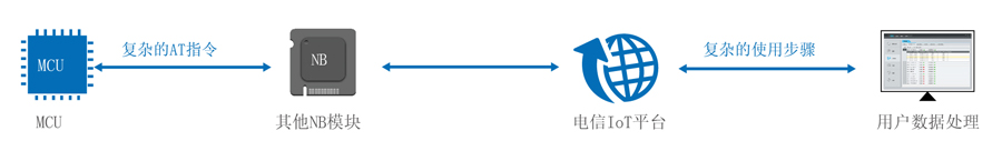 第二種傳輸形式,用戶在使用其他NB模塊、未接入有人云狀態(tài)下,MCU需要進(jìn)行復(fù)雜的AT指令操作,服務(wù)器仍要通過一系列復(fù)雜的操作環(huán)節(jié)才能實(shí)現(xiàn)數(shù)據(jù)透傳,耗費(fèi)時間和精力。