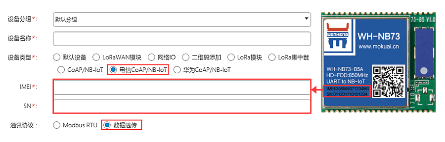 選擇“電信CoAP/NB-IoT”,填寫IEMI和SN,選擇數(shù)據(jù)透傳。