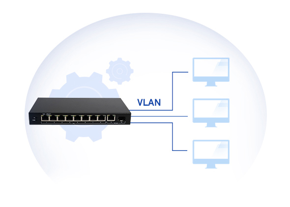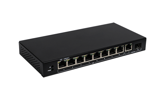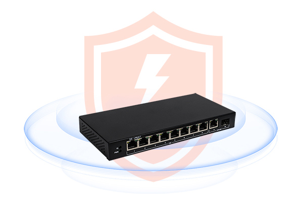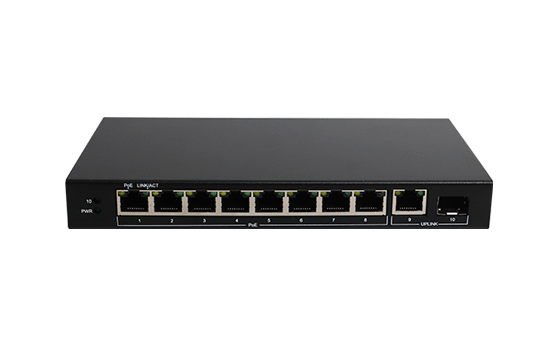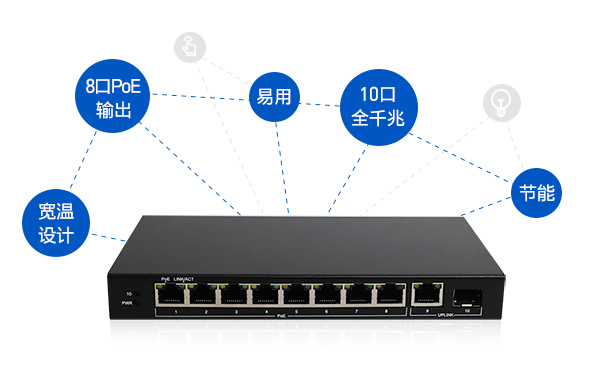 S1210P | 10口全千兆以太網(wǎng)PoE交換機(jī) SFP千兆上聯(lián)光口, 符合節(jié)能規(guī)范, 一鍵VLAN功能 S1210P是一款8千兆POE電口+1個(gè)千兆上聯(lián)電口+1個(gè)SFP光口的交換機(jī),其中8個(gè)千兆PoE電口支持POE輸出,符合IEEE 802.3af/at標(biāo)準(zhǔn),單端口供電功率最高達(dá)30W, 整機(jī)供電功率最大60W。上行端口包含1個(gè)10/100/1000Mbps電口和1個(gè)千兆SFP光口。所有端口均支持線速轉(zhuǎn)發(fā),速率最高可達(dá)1000M,且支持MDI/MDIX自動翻轉(zhuǎn)功能和速率自協(xié)商。本產(chǎn)品即插即用,使用簡單,無需任何設(shè)置。機(jī)身材質(zhì)采用磨砂金屬鐵殼工藝制造,滿足寬溫工作環(huán)境要求,且能抗壓、耐磨、防爆。
