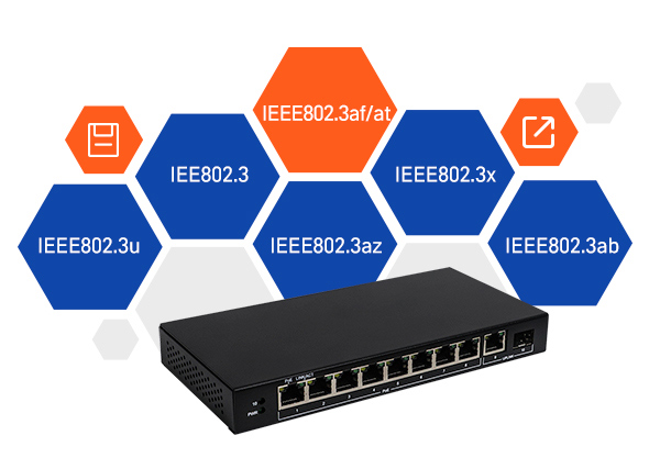 - 符合IEE802.3 、IEEE802.3u 、IEEE802.3x 、IEEE802.3az、IEEE802.3ab、IEEE802.3af/at標(biāo)準(zhǔn)