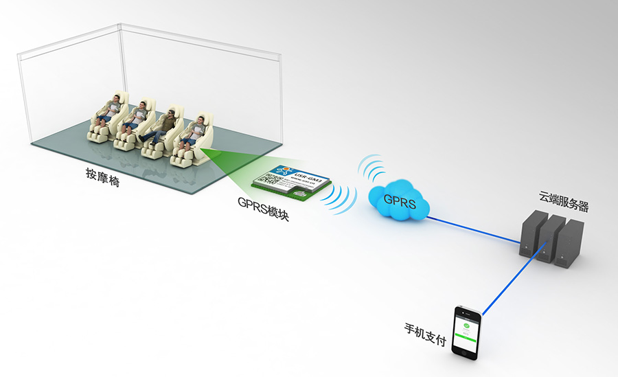 商用按摩椅采用2/3/4G DTU與云端服務器進行連接,顧客通過手機的移動支付,微信或者支付寶對椅子把手上的二維碼進行掃碼支付,手機將支付信息上傳到遠端服務器,云端服務器通過2/3/4G DTU控制按摩椅按照支付的相關費用開機運行。
