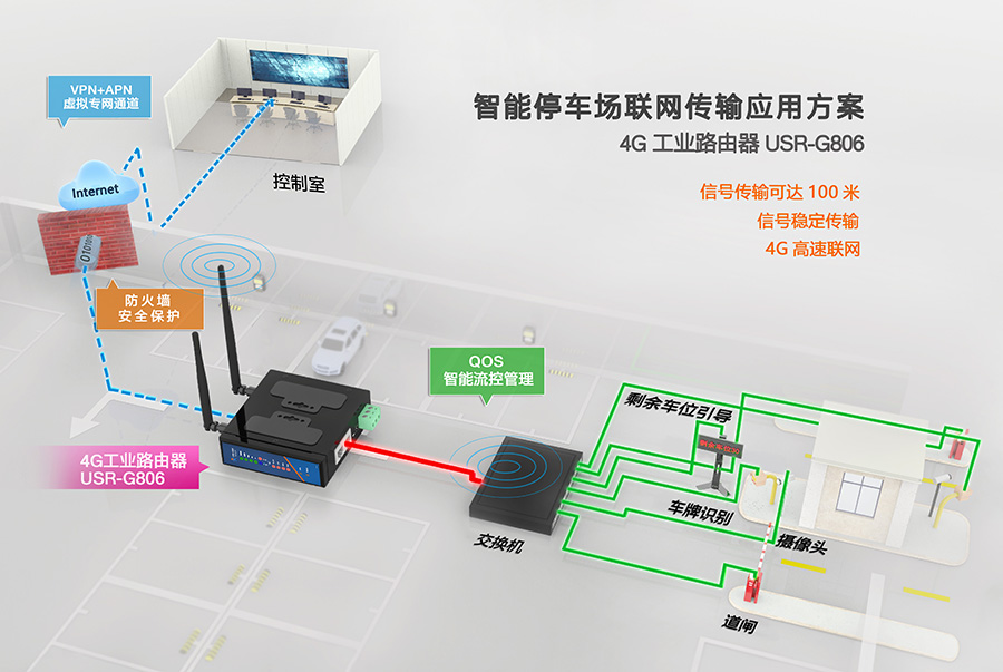 1、當(dāng)車輛離場時,終端識別和傳感設(shè)備會自動采集車輛號牌等信息,并通過4G工業(yè)無線路由器USR-G806傳輸至遠程控制中心;