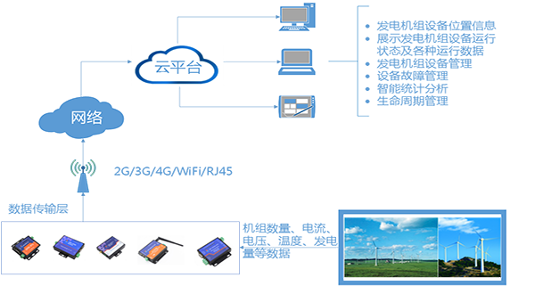 有人發電機組物聯網遠程監控系統對網絡內的風力發電機組實時的監測和控制,實現了對風力發電機組的遠程在線監測、跟蹤、狀態確認和控制及高效節能運行。從而提高風力發電機組設備的資源利用率和生產力水平,有效提高機組運行安全性、任務可靠性以及降低系統全壽命周期費用,有利于預防機組惡性事故發生、避免人身傷亡及巨大經濟損失。