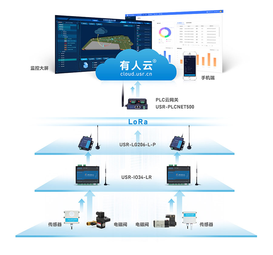 本案例基于LoRa無線通信技術,將終端傳感器采集到的數據通過LoRa設備通訊,上傳至PLC;還可通過接收上位機工作指令,對終端電磁閥等設備進行遠程控制。