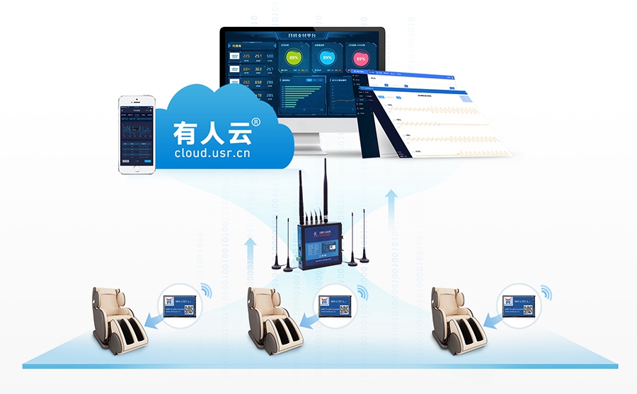 為方便運營商通過平臺管理和監控所有按摩椅,為滿足不用應用場景,有人物聯網提出了基于無線通信技術的共享按摩解決方案,主要實現共享按摩椅的資產定位、機器運行狀態數據的實時監控、信息靈活組網傳輸、遠程控制等功能。